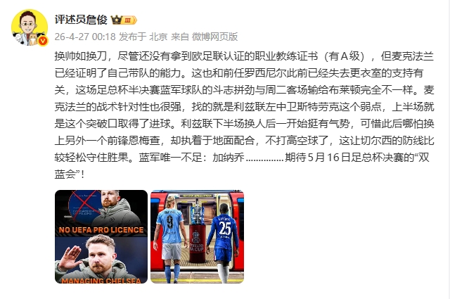 04月27日讯 切尔西1-0战胜利兹联晋级足总杯决赛,将对阵曼城。詹俊发文点评了本场比赛。